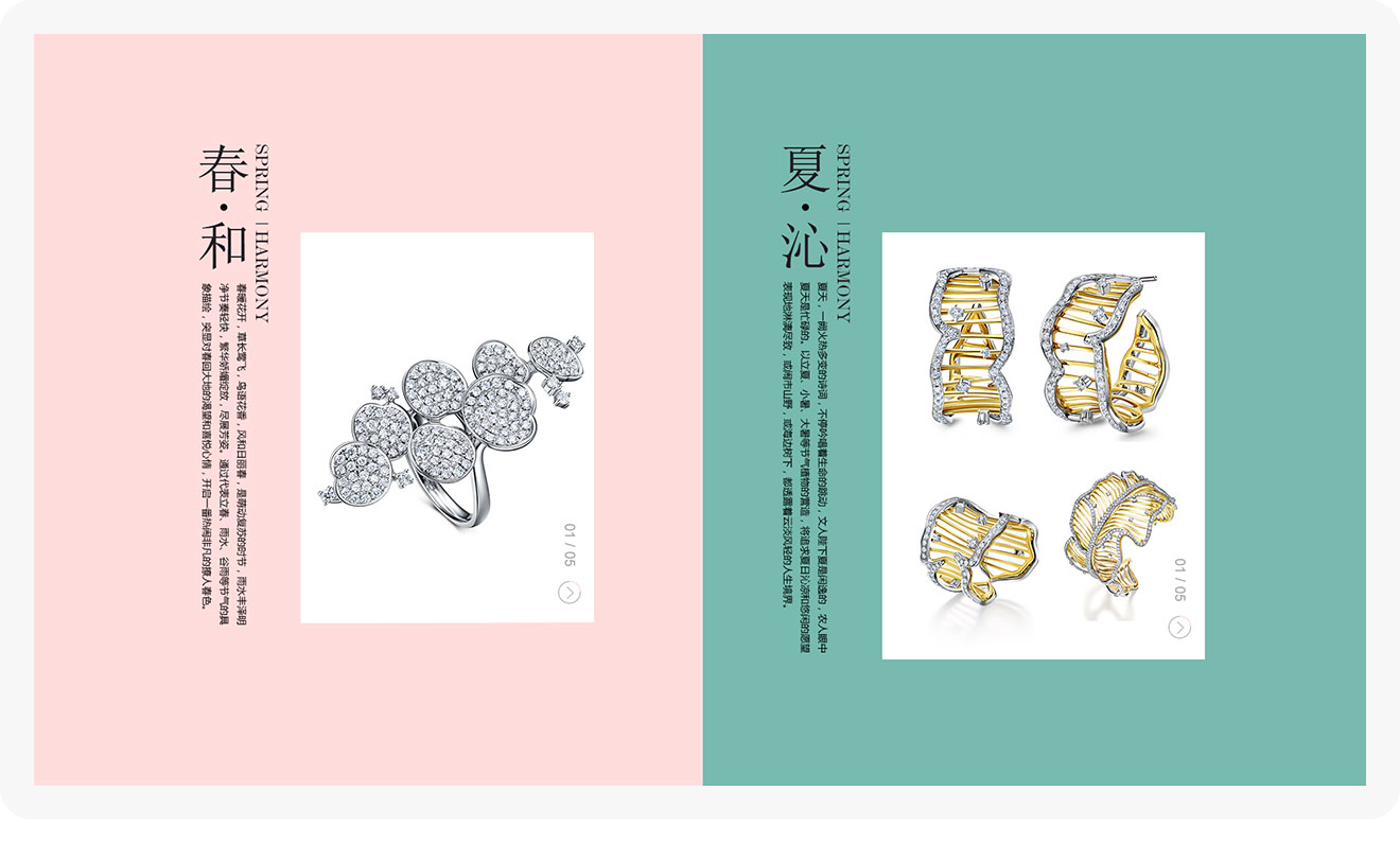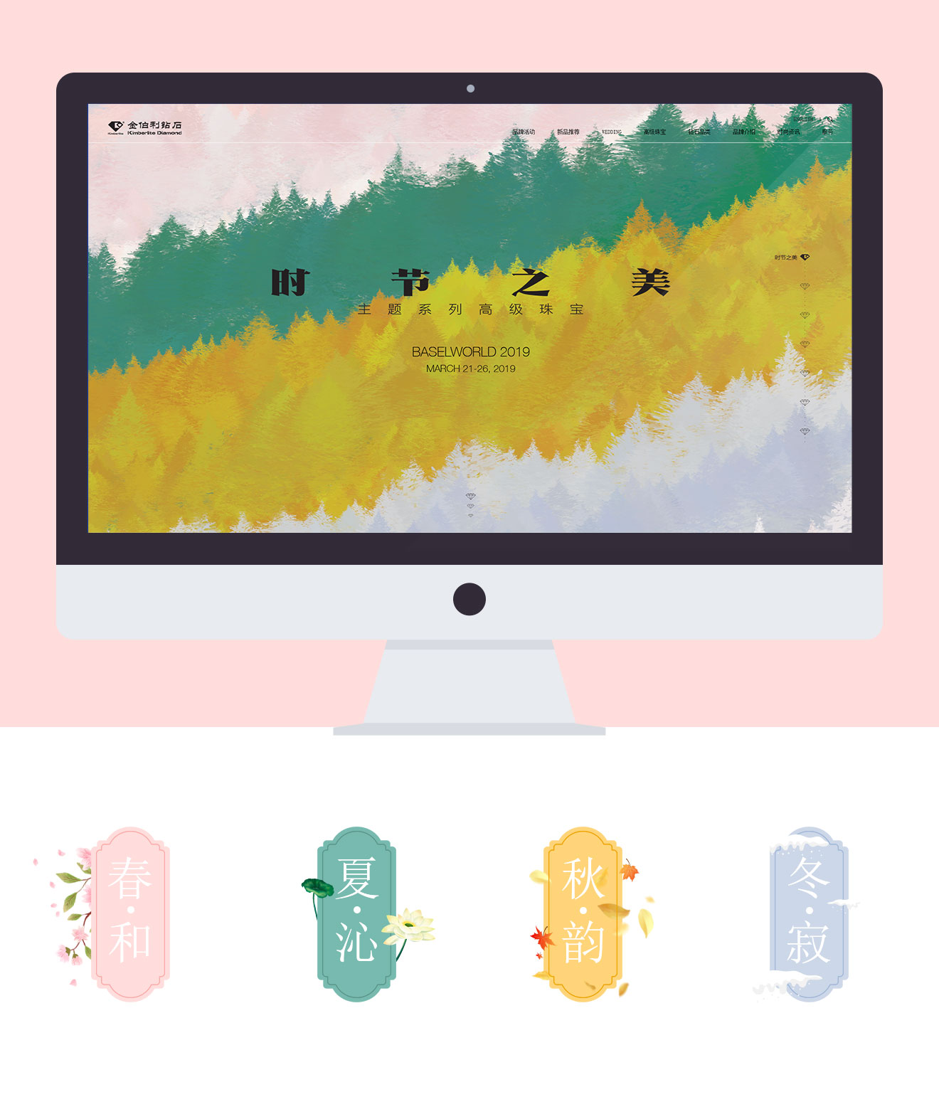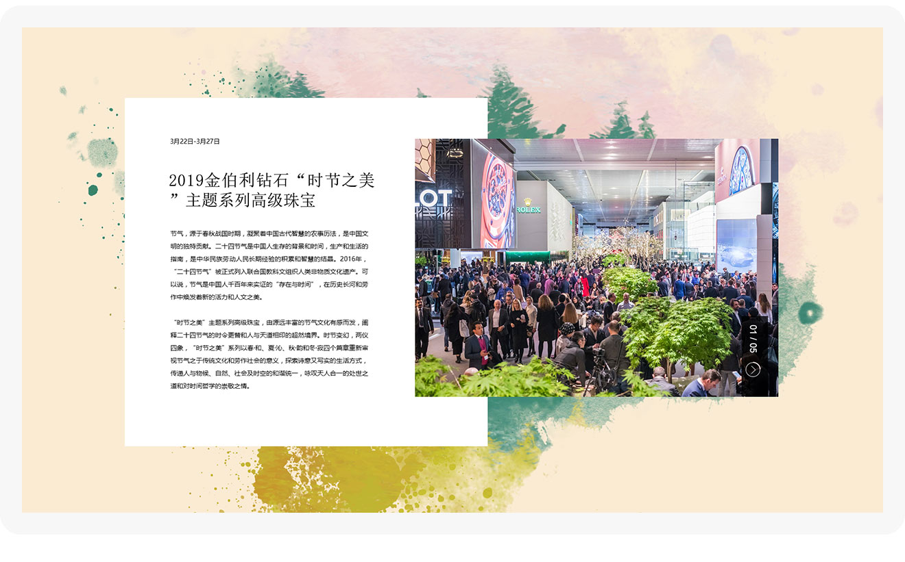 圍繞金伯利巴塞爾活動(dòng)主題“時(shí)節(jié)之美”的一個(gè)活動(dòng)專題,展示四個(gè)季節(jié)對(duì)應(yīng)的高級(jí)珠寶,頁(yè)面整體風(fēng)格用簡(jiǎn)潔干凈的版面和不同季節(jié)的顏色來突出四季的不同變化,每個(gè)季節(jié)對(duì)應(yīng)的插畫來體現(xiàn)春、夏、秋、冬。