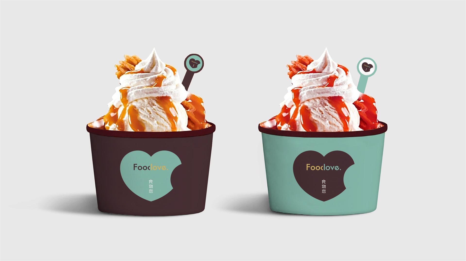 為了塑造品牌的時尚品味、簡約現代的調性,我們選取了無襯線體。Food&love,在視覺表現上共用一筆,且使用兩種顏色,初看為兩個個體,但細看又不可分割,創意表現易與情感形成共鳴,明明是獨立的個體,卻難分難舍的依戀,有一種戀戀不舍的情意。此love情意滿滿,既是香氣四溢的食物之戀,亦是深情濃意的情感之約。 標志簡約精致,傳達出一種健康、溫馨、浪漫、小情調的氣質及理念。