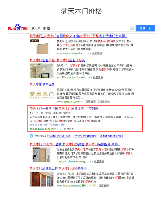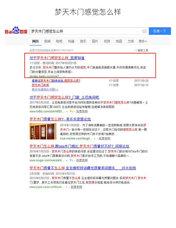 在前期的項目溝通和執(zhí)行上,助騰團隊對此項目投入了空前的精力和創(chuàng)作熱情,針對夢天木門在互聯(lián)網(wǎng)上的口碑信息進行的全面的抓取和梳理。保證品牌在互聯(lián)網(wǎng)信息內(nèi)容展示上能以更好的形象展示出來,同時結(jié)合競品投放信息和渠道進行分析,在相關(guān)競品可以觸及到的點上進行夢天木門的品牌信息曝光,提升網(wǎng)絡(luò)覆蓋面。