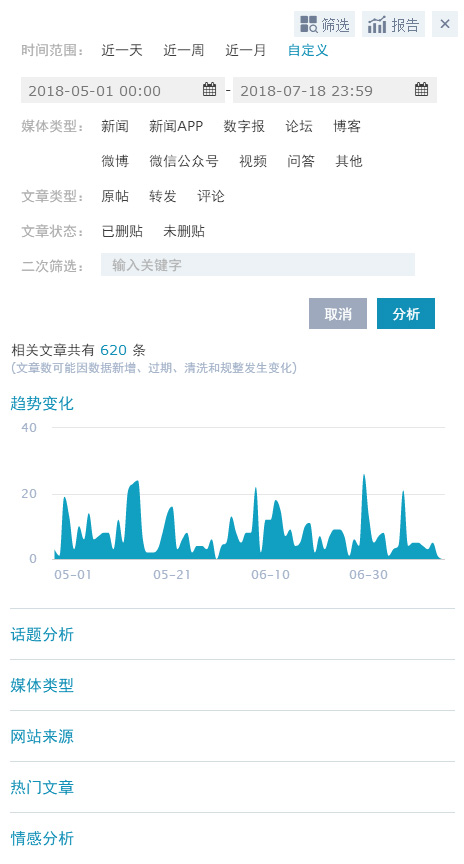 可自主設置每個主題2000字符以內(nèi)的關(guān)鍵詞組合進行實時監(jiān)測,自由修改,添加,刪除,信息實時同步刷新